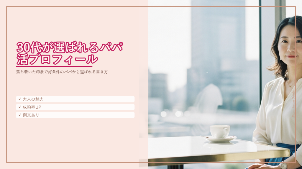 パパ活のプロフィール、どうやって書けばいいか迷いますよね。特に30代だと「20代の子たちに勝てるのかな…」って不安になる気持ち、すごくわかります。 でも実は、30代だからこそ選ばれるポイントって意外とあるんです。 この記事では、30代女性がパパ活プ...
